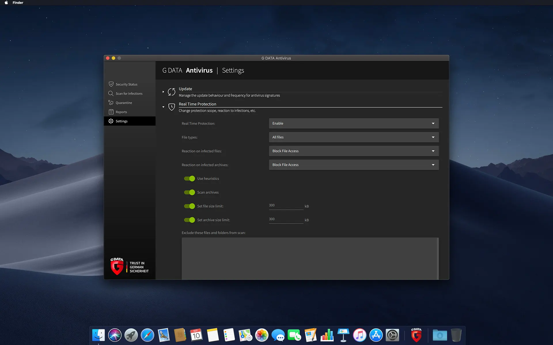 A G Data Antivirus for macOS kezelőfelülete angol nyelven használható.