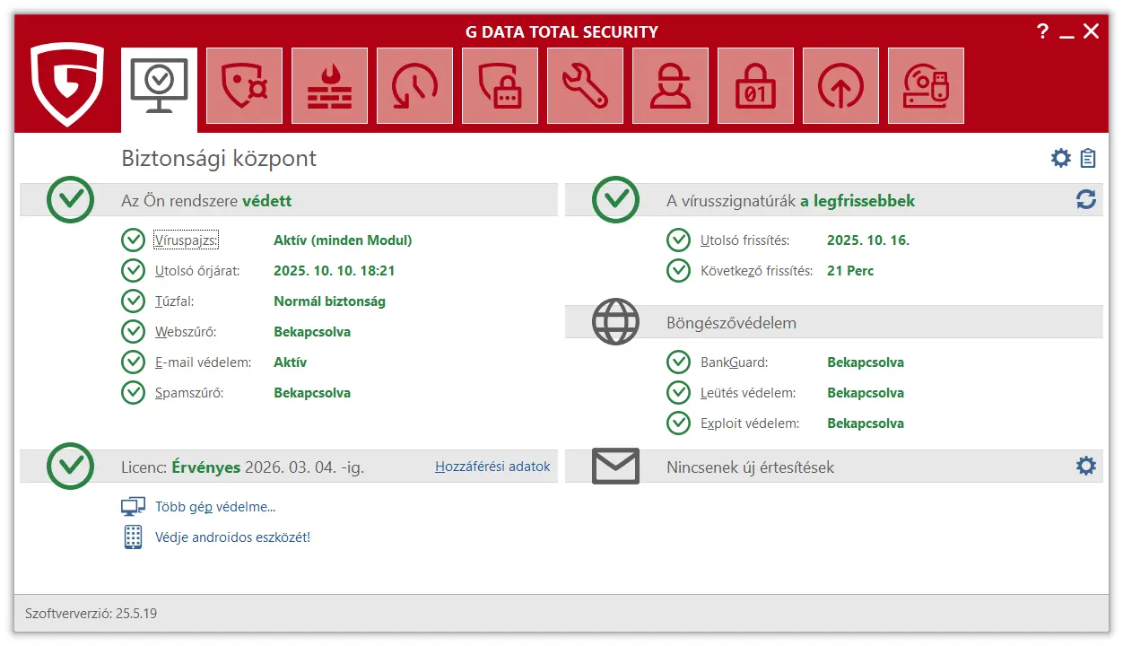 A G DATA TOTAL SECURITY két keresőmotorjával, kiváló heurisztikus képességével, felhő alapú védelmével valóban egyedülálló védelmet nyújt a kártevőkkel szemben.A G DATA TOTAL SECURITY tűzfala blokkolja a betörési kísérleteket, levélszemétszűrője pedig mentesít a kéretlen reklámlevelektől. A szülői felügyelet segítségével korlátozhatjuk, hogy gyermekeink mennyi ideig használhatják az internetet, és milyen oldalakat tekinthetnek meg.