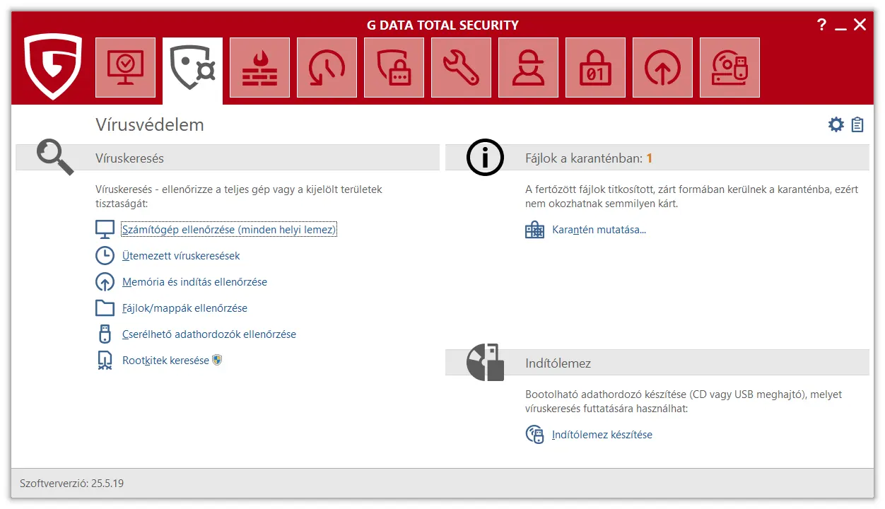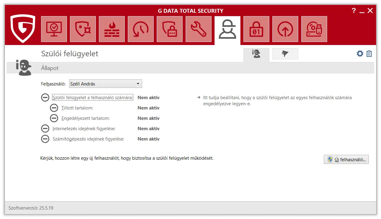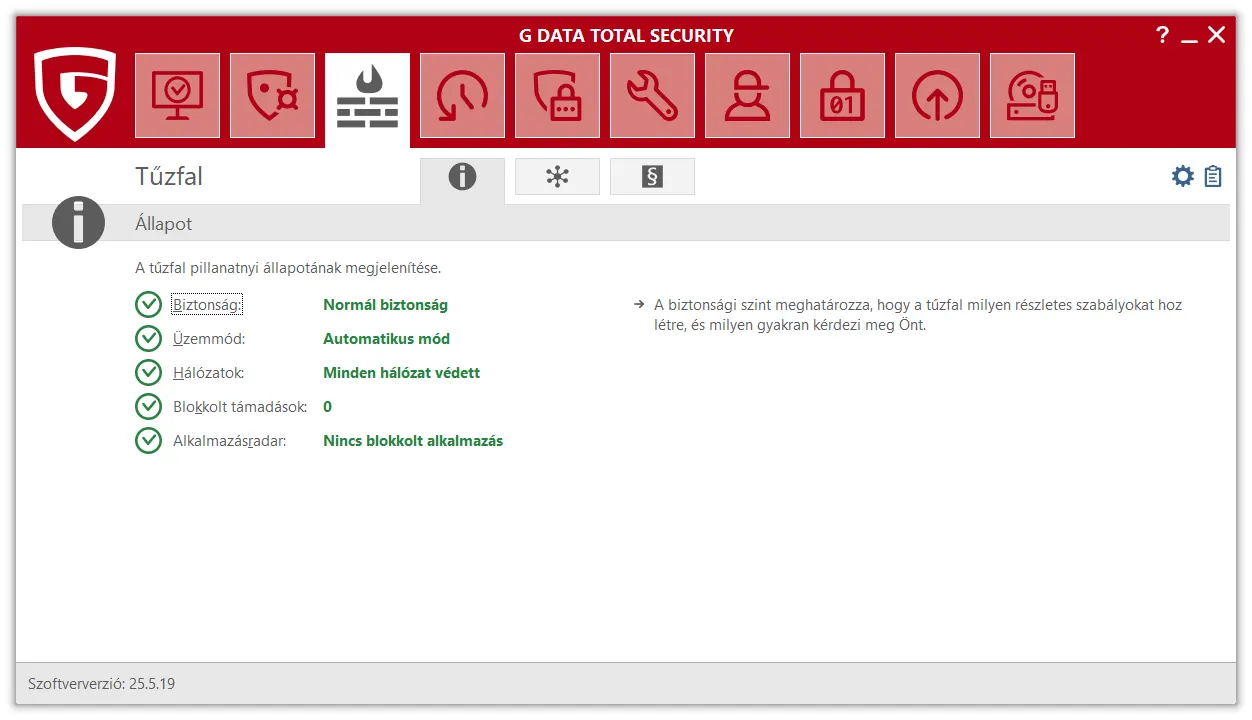 A G DATA TOTAL SECURITY két keresőmotorjával, kiváló heurisztikus képességével, felhő alapú védelmével valóban egyedülálló védelmet nyújt a kártevőkkel szemben.A G DATA TOTAL SECURITY tűzfala blokkolja a betörési kísérleteket, levélszemétszűrője pedig mentesít a kéretlen reklámlevelektől. A szülői felügyelet segítségével korlátozhatjuk, hogy gyermekeink mennyi ideig használhatják az internetet, és milyen oldalakat tekinthetnek meg.